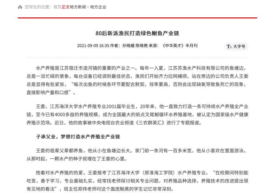 2009年和2014年,他先后注册成立了江苏新渔人水产科技有限公司、江苏苏渔水产科技有限公司,公司的业务从最初的水产品加工渐渐拓展到水产育苗、池塘工业化循环水养殖、工厂化养殖、水产品贸易等业务,逐渐成为当地有影响力的综合性规模化水产企业。