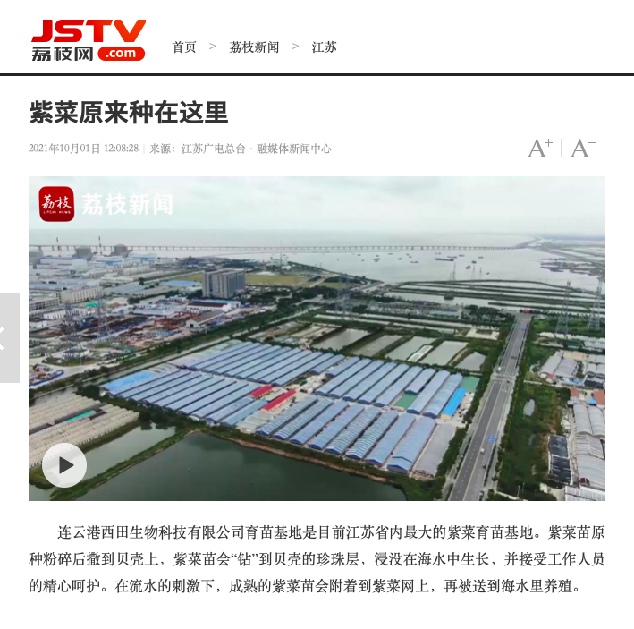 连云港西田生物科技有限公司育苗基地是目前江苏省内最大的紫菜育苗基地。紫菜苗原种粉碎后撒到贝壳上,紫菜苗会“钻”到贝壳的珍珠层,浸没在海水中生长,并接受工作人员的精心呵护。在流水的刺激下,成熟的紫菜苗会附着到紫菜网上,再被送到海水里养殖。