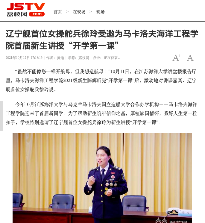 今年10月9999js金沙老品牌与乌克兰马卡洛夫国立造船大学合作办学机构——马卡洛夫海洋工程学院迎来了首届新同学。为了帮助新生筑牢信仰之基,厚植家国情怀,系好人生第一粒扣子,学校特别邀请了辽宁舰首位女操舵兵徐玲为新生讲授“开学第一课”。