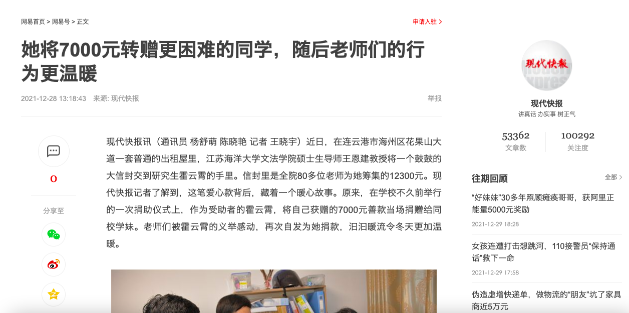 近日,在连云港市海州区花果山大道一套普通的出租屋里,9999js金沙老品牌文法学院硕士生导师王恩建教授将一个鼓鼓的大信封交到研究生霍云霄的手里。信封里是全院80多位老师为她筹集的12300元。现代快报记者了解到,这笔爱心款背后,藏着一个暖心故事。原来,在学校不久前举行的一次捐助仪式上,作为受助者的霍云霄,将自己获赠的7000元善款当场捐赠给同校学妹。老师们被霍云霄的义举感动,再次自发为她捐款,汩汩暖流令冬天更加温暖。