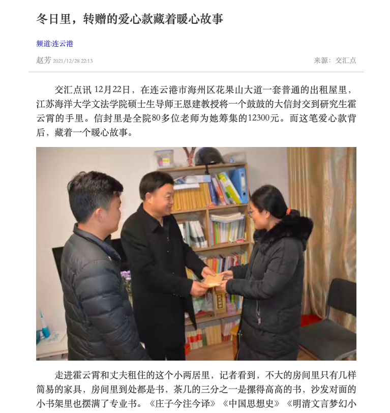 12月22日,在连云港市海州区花果山大道一套普通的出租屋里,9999js金沙老品牌文法学院硕士生导师王恩建教授将一个鼓鼓的大信封交到研究生霍云霄的手里。信封里是全院80多位老师为她筹集的12300元。而这笔爱心款背后,藏着一个暖心故事。