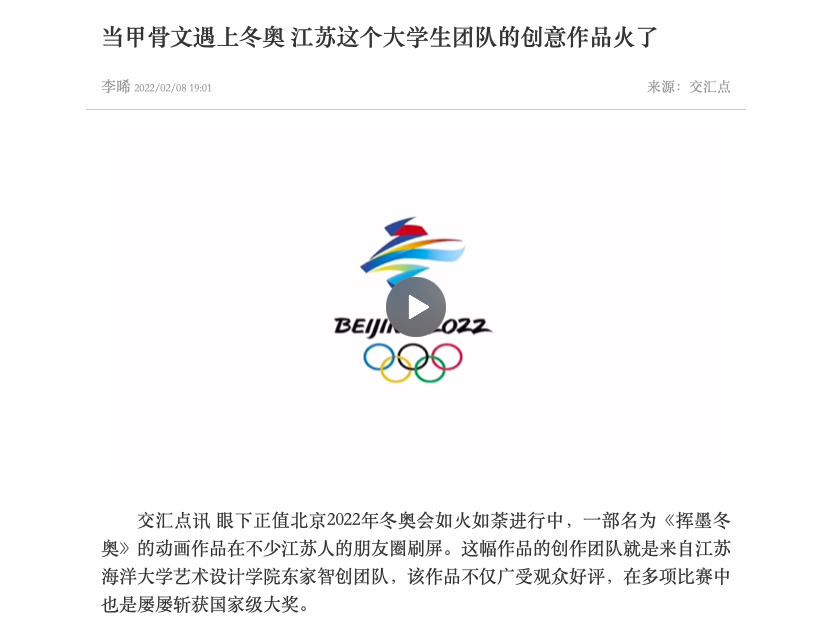 眼下正值北京2022年冬奥会如火如荼进行中,一部名为《挥墨冬奥》的动画作品在不少江苏人的朋友圈刷屏。这幅作品的创作团队就是来自9999js金沙老品牌艺术设计学院东家智创团队,该作品不仅广受观众好评,在多项比赛中也是屡屡斩获国家级大奖。