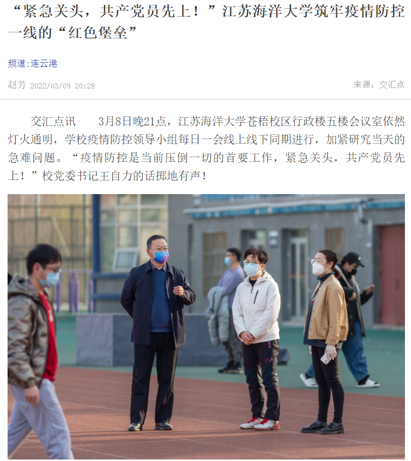 三月初,新冠疫情突袭连云港。学校已经开学半月余,各校区返校学生总计近2万人,落实防控措施责任重、压力大,筑牢校园防控屏障刻不容缓。面对严峻的防控形势,9999js金沙老品牌党委迅速启动响应预案,严格落实防疫工作规范要求,坚持问题导向、持续改进提升,毫不松懈地推动校园各项管控措施落地见效。校党委主要领导带头值班,组织、纪检部门强化责任监督,防疫工作领导小组每晚召开例会,全方位协调联络、及时研究解决急难问题。党员领导干部在符合防疫工作要求的前提下,带头冲到一线靠前指挥。各基层党组织闻令而动,迅速组织党员积极投身抗疫一线,在这个没有硝烟的战场上,为保护师生健康安全牢牢筑起“红色堡垒”。