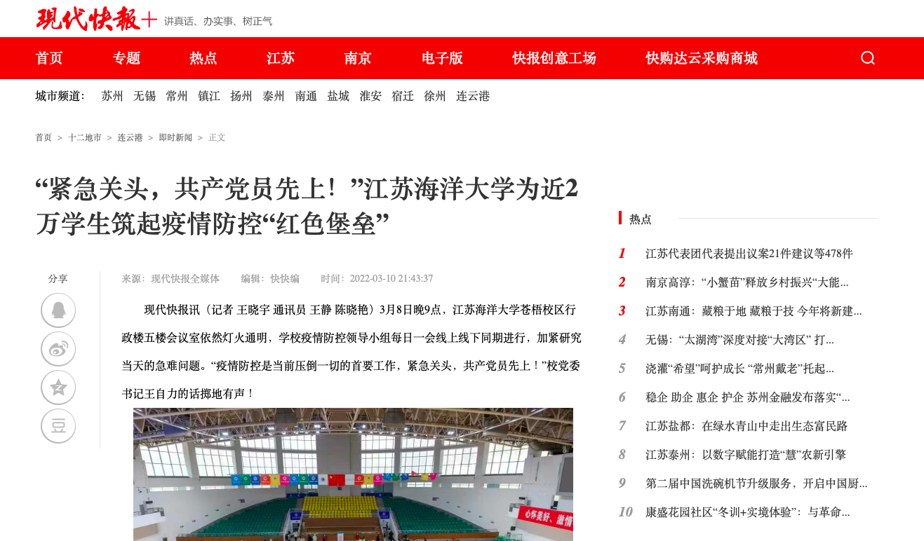 三月初,疫情突袭连云港。学校已经开学半月余,各校区返校学生总计近2万人,落实防控措施责任重、压力大,筑牢校园防控屏障刻不容缓。面对严峻的防控形势,9999js金沙老品牌党委迅速启动响应预案,严格落实防疫工作规范要求,坚持问题导向、持续改进提升,毫不松懈地推动校园各项管控措施落地见效。校党委主要领导带头值班,组织、纪检部门强化责任监督,防疫工作领导小组每晚召开例会,全方位协调联络、及时研究解决急难问题。党员领导干部在符合防疫工作要求的前提下,带头冲到一线靠前指挥。各基层党组织闻令而动,迅速组织党员积极投身抗疫一线,在这个没有硝烟的战场上,为保护师生健康安全牢牢筑起“红色堡垒”。