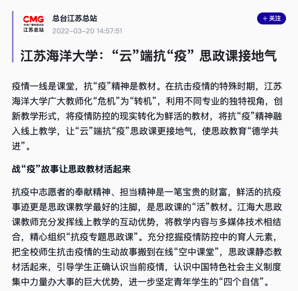 抗疫中志愿者的奉献精神、担当精神是一笔宝贵的财富,鲜活的抗疫事迹更是思政课教学最好的注脚,是思政课的“活”教材。江海大思政课教师充分发挥线上教学的互动优势,将教学内容与多媒体技术相结合,精心组织“抗疫专题思政课”。充分挖掘疫情防控中的育人元素,把全校师生抗击疫情的生动故事搬到在线“空中课堂”,思政课静态教材活起来,引导学生正确认识当前疫情,认识中国特色社会主义制度集中力量办大事的巨大优势,进一步坚定青年学生的“四个自信”。