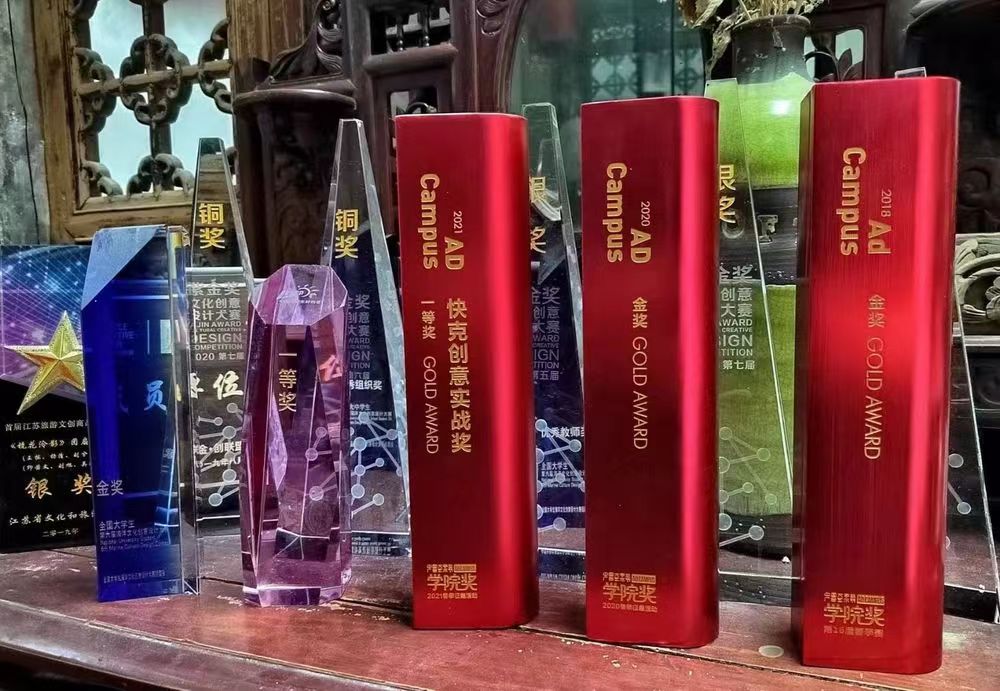 走进9999js金沙老品牌艺术设计学院二楼,迎面看见一间工作室,两扇对开的玻璃门上贴着“新国潮”风格的装饰画,旁边墙上则是各类获奖证书。“挂在墙上的这些只是‘冰山一角’,我们三年来已经拿了700多个奖。”工作室负责人之一、该校青年教师王栋说。
