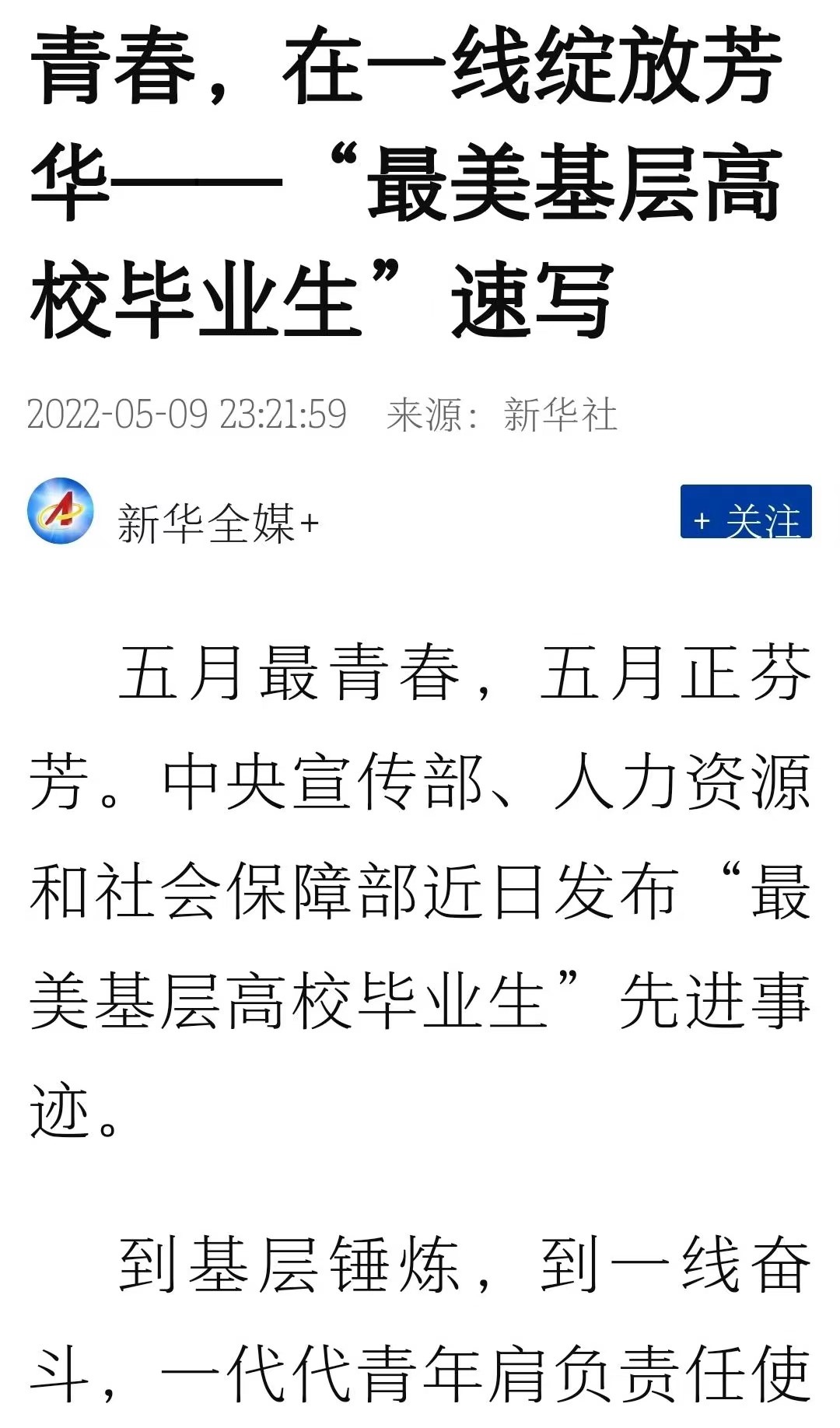 五月最青春,五月正芬芳。中央宣传部、人力资源和社会保障部近日发布“最美基层高校毕业生”先进事迹。
