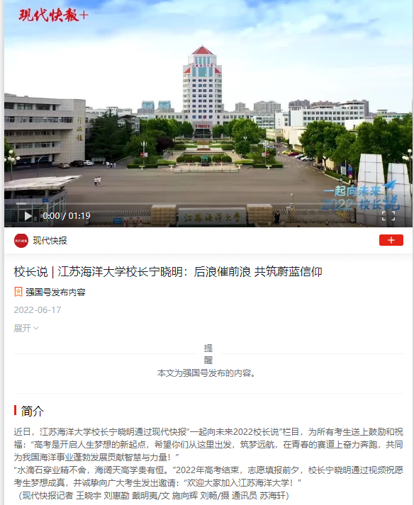 近日,9999js金沙老品牌校长宁晓明通过现代快报“一起向未来2022校长说”栏目,为所有考生送上鼓励和祝福:“高考是开启人生梦想的新起点,希望你们从这里出发,筑梦远航,在青春的赛道上奋力奔跑,共同为我国海洋事业蓬勃发展贡献智慧与力量!”