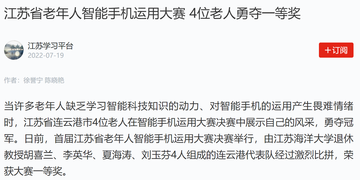 连云港市科学技术协会工作人员曹家端表示,老年人之所以会遇到“数字鸿沟”,并非他们学不会,而是他们缺乏一定的动力或者必要的指导。而此次比赛,连云港代表队获得一等奖的好成绩,在很大程度上能够激发老人的求知欲,鼓励他们勇敢尝试新领域,帮助更多中老年人尽快掌握智能科技的日常应用技能。