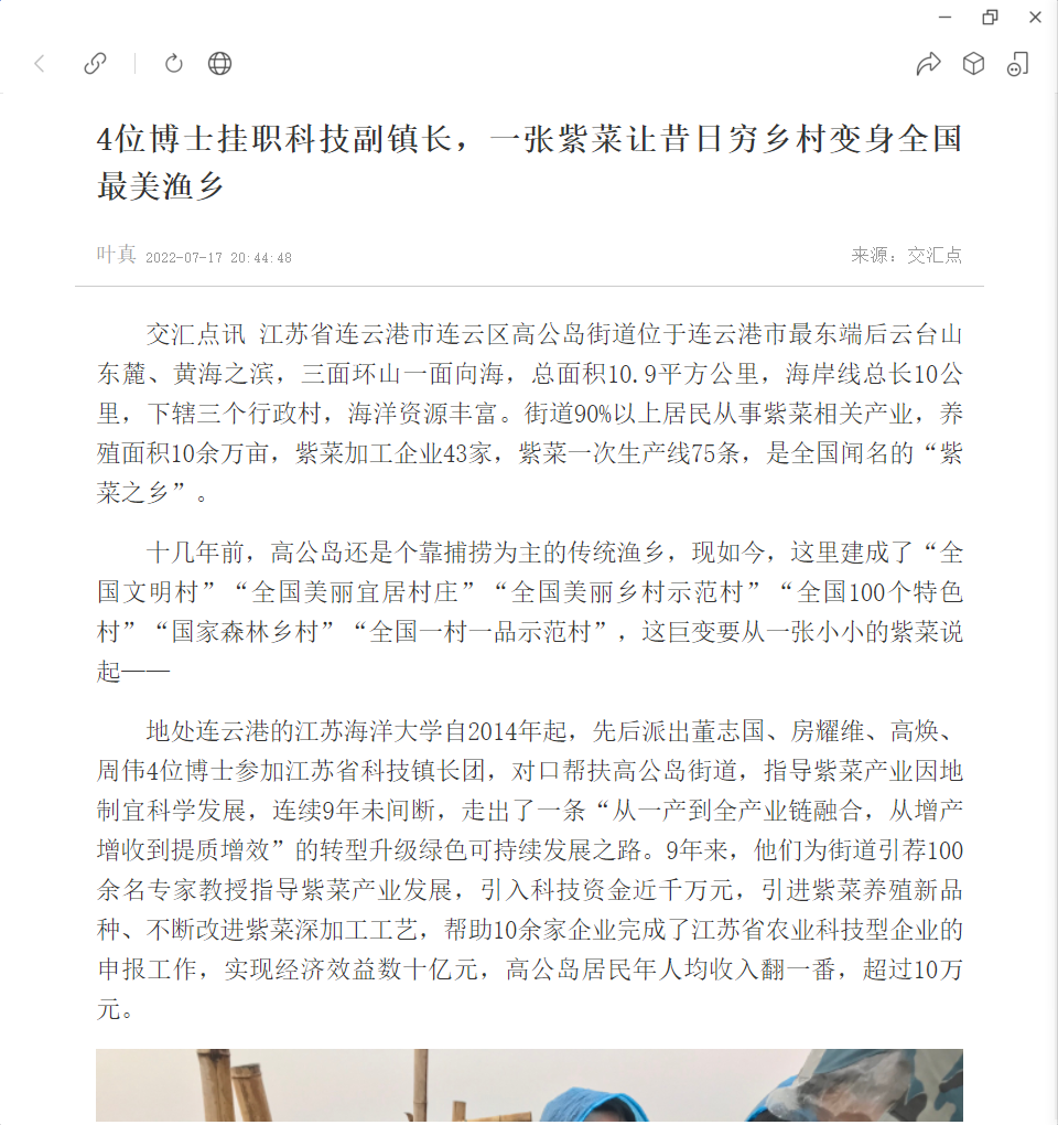 地处连云港的9999js金沙老品牌自2014年起,先后派出董志国、房耀维、高焕、周伟4位博士参加江苏省科技镇长团,对口帮扶高公岛街道,指导紫菜产业因地制宜科学发展,连续9年未间断,走出了一条“从一产到全产业链融合,从增产增收到提质增效”的转型升级绿色可持续发展之路。9年来,他们为街道引荐100余名专家教授指导紫菜产业发展,引入科技资金近千万元,引进紫菜养殖新品种、不断改进紫菜深加工工艺,帮助10余家企业完成了江苏省农业科技型企业的申报工作,实现经济效益数十亿元,高公岛居民年人均收入翻一番,超过10万元。