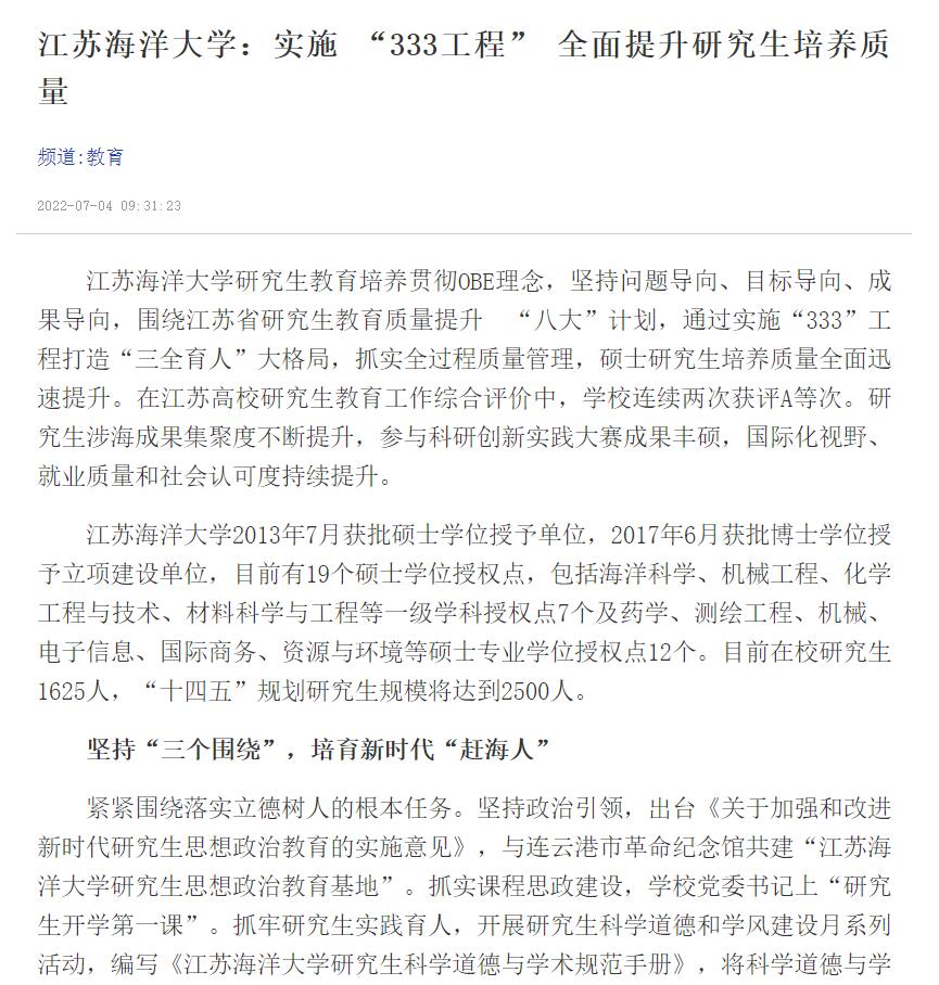 9999js金沙老品牌研究生教育培养贯彻OBE理念,坚持问题导向、目标导向、成果导向,围绕江苏省研究生教育质量提升 “八大”计划,通过实施“333”工程打造“三全育人”大格局,抓实全过程质量管理,硕士研究生培养质量全面迅速提升。在江苏高校研究生教育工作综合评价中,学校连续两次获评A等次。研究生涉海成果集聚度不断提升,参与科研创新实践大赛成果丰硕,国际化视野、就业质量和社会认可度持续提升。