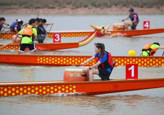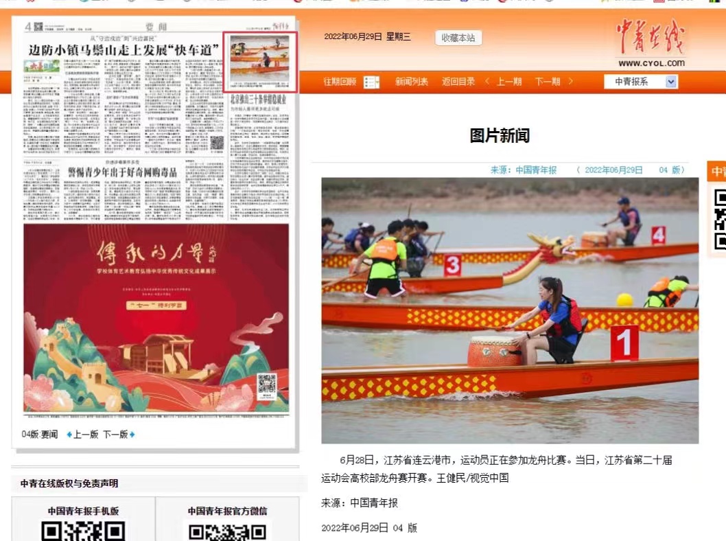 6月28日,江苏省连云港市,运动员正在参加龙舟比赛。当日,江苏省第二十届运动会高校部龙舟赛开赛。
