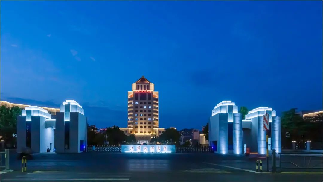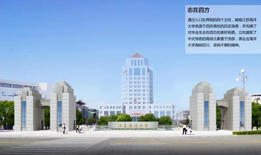 江苏世博设计研究院有限公司捐赠的四柱塔设计方案被选中。该方案在理念上坚持塑造和谐统一、质朴天成的建筑形体,外观与现有建筑风格、体量、元素形成有机整体。四个塔体形象与校园的最高建筑——教学主楼相呼应,构成舰船航行的视觉效果,蕴含乘风破浪、砥砺前行的奋斗精神,也隐含四校归一的发展历程。同时,四个塔体创造了敦厚、庄重的建筑氛围,与校园环境融为一体。方案在四个塔体顶部采用阴刻“波浪条纹”的手法点出了大学的海洋特色。