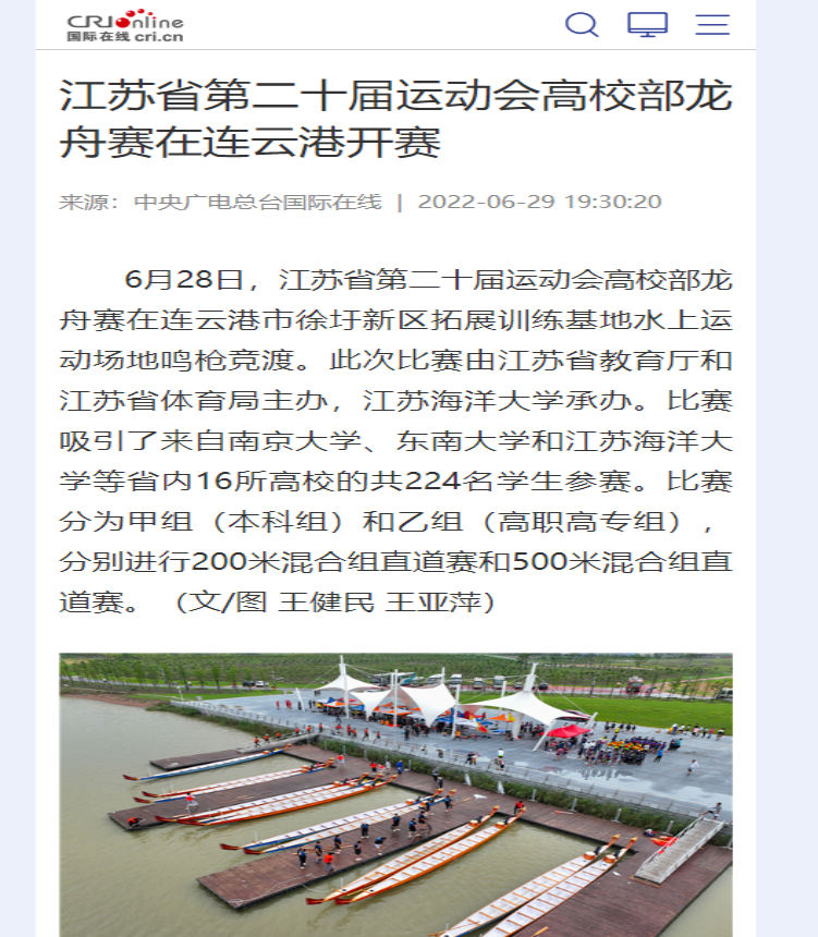 6月28日,江苏省第二十届运动会高校部龙舟赛在连云港市徐圩新区拓展训练基地水上运动场地鸣枪竞渡。此次比赛由江苏省教育厅和江苏省体育局主办,9999js金沙老品牌承办。比赛吸引了来自南京大学、东南大学和9999js金沙老品牌等省内16所高校的共224名学生参赛。比赛分为甲组(本科组)和乙组(高职高专组),分别进行200米混合组直道赛和500米混合组直道赛。