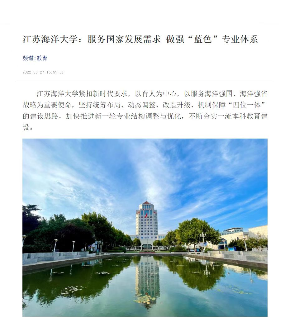 统筹布局,打造蓝色专业体系。该校制定“1+5”发展规划,坚持“扎根淮海,面向黄海,辐射沿海,走向深海”的服务方向,主动谋划、科学布局,深入探索与区域经济社会发展紧密结合的办学之路。一是建强学科支撑。以“海洋科学”省级优势学科为基础,围绕海洋资源开发利用、海洋生态环境保护治理重点领域,聚力高水平创新团队和平台建设,积极培育新兴学科增长极,构筑“海洋主线、理工主体、人文基础,多学科融合发展”的学科体系,以学科发展带动专业建设。二是构建特色专业集群。充分发挥人才培养集成优势,对接江苏海洋经济主导产业,重点发展海洋科学类、海洋工程类相关专业,积极增设涉海专业及专业方向,重组成立了海洋科学与水产学院、海洋技术与测绘学院、海洋工程学院。响应国家医药产业布局“中华药港”建设急需,校企联合,重点建设药学类专业,实现专业链与产业链的有效对接。三是拓展开放办学。依托地处“一带一路”重要节点城市、新亚欧大陆桥东桥头堡连云港市的独特区位,主动融入“一带一路”建设,大力实施开放办学拓展计划,积极与乌克兰国立造船大学等沿线国家高校开展海洋人才培养交流合作,扩大留学生规模,马卡洛夫海洋工程学院中外合作办学机构获得教育部批准,2个中外合作办学项目顺利实施,专业特色优势不断强化。近年来,该校28个专业入选国家一流专业“双万计划”,获批省级产教融合型品牌专业4个,国际化人才培养品牌专业1个,4个江苏省品牌专业一期工程项目全部通过验收, 5个专业顺利通过工程教育专业认证,进入了“全球工程教育第一方阵”。
