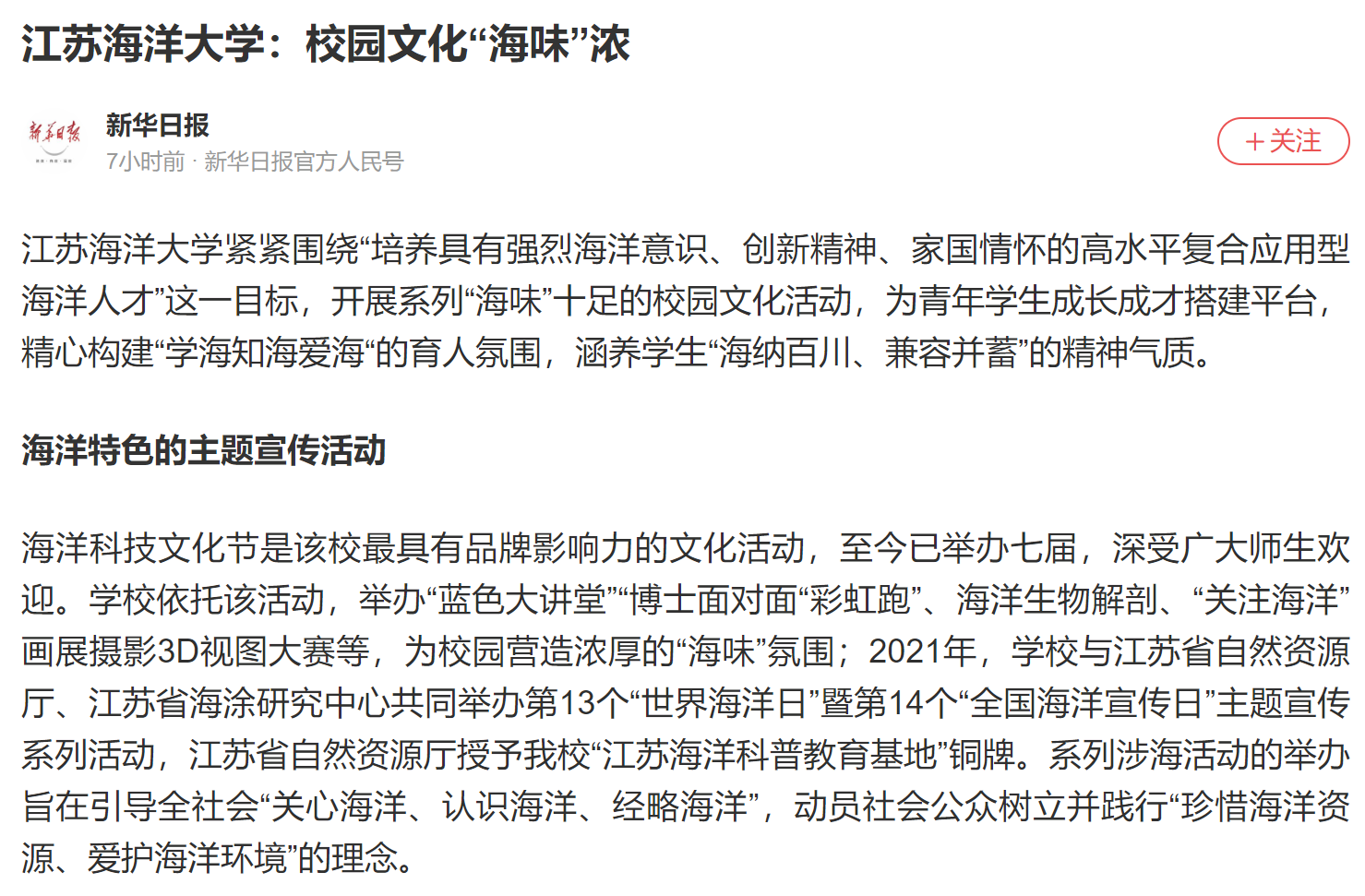 海洋科技文化节是该校最具有品牌影响力的文化活动,至今已举办七届,深受广大师生欢迎。学校依托该活动,举办“蓝色大讲堂”“博士面对面“彩虹跑”、海洋生物解剖、“关注海洋”画展摄影3D视图大赛等,为校园营造浓厚的“海味”氛围;2021年,学校与江苏省自然资源厅、江苏省海涂研究中心共同举办第13个“世界海洋日”暨第14个“全国海洋宣传日”主题宣传系列活动,江苏省自然资源厅授予我校“江苏海洋科普教育基地”铜牌。系列涉海活动的举办旨在引导全社会“关心海洋、认识海洋、经略海洋”,动员社会公众树立并践行“珍惜海洋资源、爱护海洋环境”的理念。