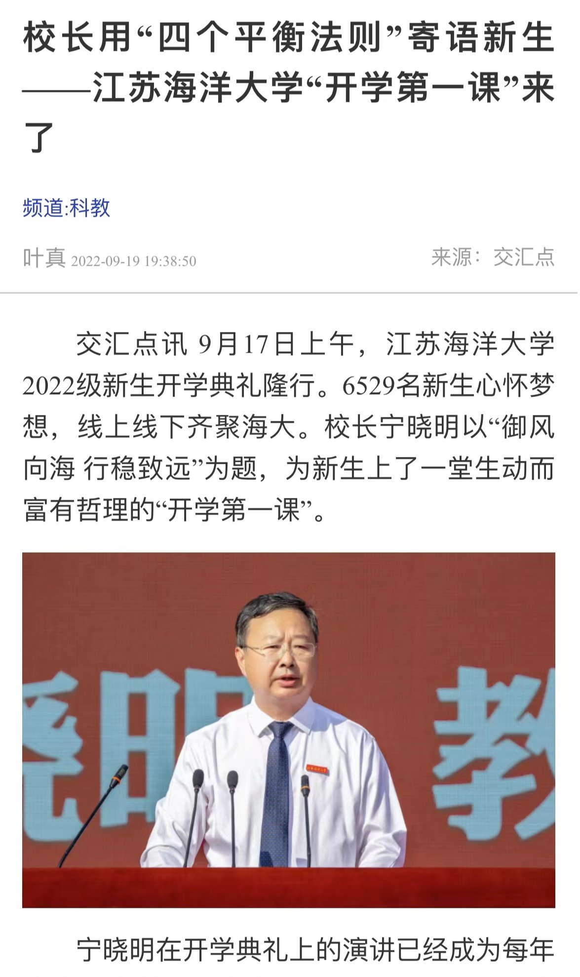 宁晓明在开学典礼上的演讲已经成为每年全校师生共同期待的“思政金课”。从100个“新”、100个“大”,到100个“学”,他每年围绕一个新主题,用连续三年的开学第一课,将学校更名后的发展愿景与青年学生的人生奋斗目标巧妙结合,将理想信念教育和海洋意识教育融入入学教育中,引导学生心怀蔚蓝信仰,勇担新时代使命,为建设海洋强国贡献青春力量。
