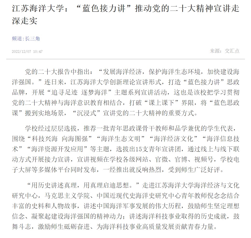 学校经过层层选拔,推荐一批青年思政课骨干教师和品学兼优的学生代表,围绕“科技兴海 向海图强”“海洋生态文明”“海洋经济文化”“海洋信息技术”“海洋资源开发应用”等主题,选拔出15支青年宣讲团,通过线上与线下联动方式开展接力宣讲,宣讲视频在学校各级网站、官微、官博、视频号,学校电子大屏等多媒体平台同时发布,一经推出就反响热烈,受到师生广泛好评。