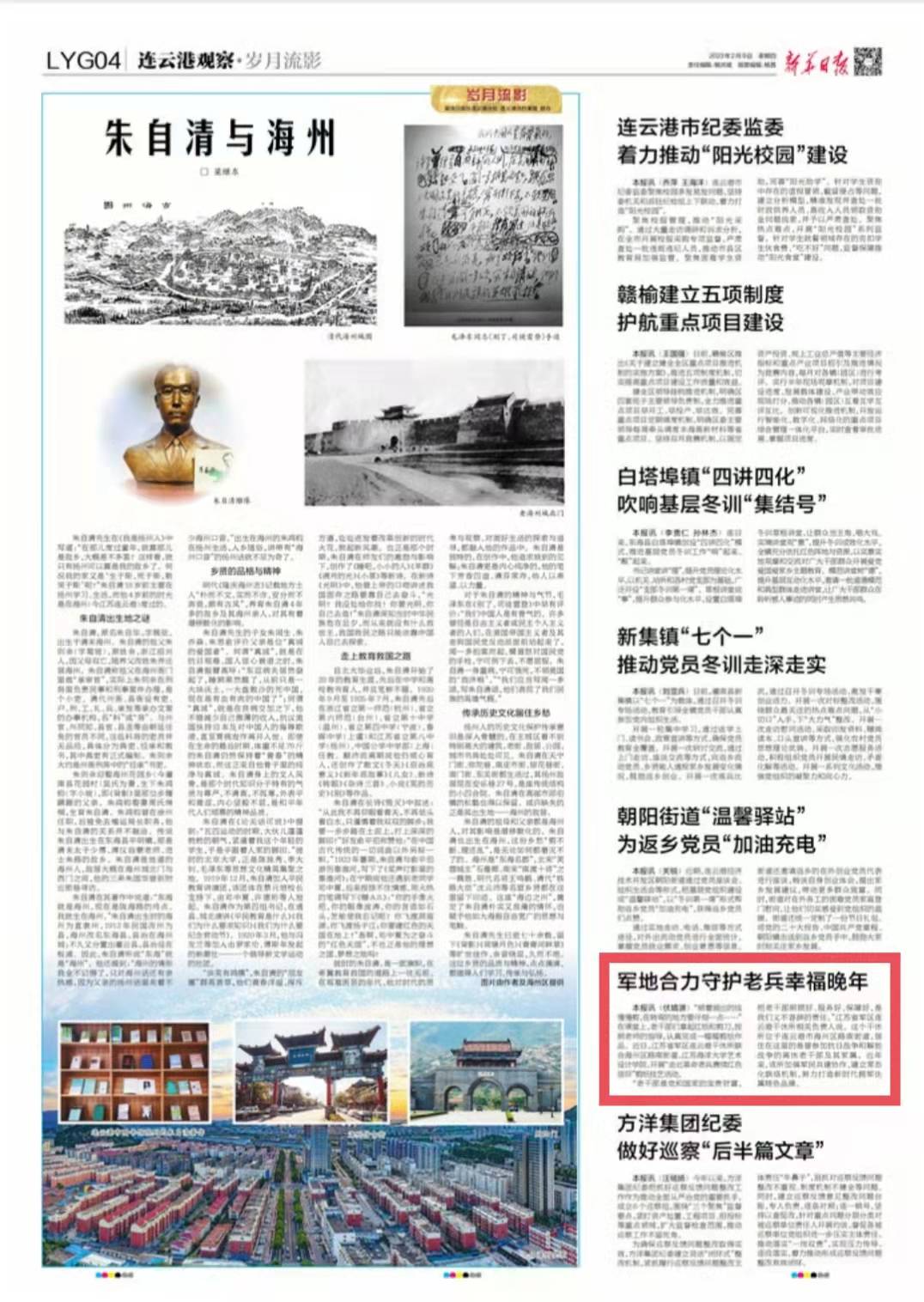 “老干部是党和国家的宝贵财富,把老干部照顾好、服务好、保障好,是我们义不容辞的责任。”江苏省军区连云港干休所相关负责人说。这个干休所位于连云港市海州区路南街道,居住在这里的是曾参加抗日战争和解放战争的离休老干部及其家属。近年来,该所加强军民共建协作,建立常态化联络机制,努力打造新时代拥军优属特色品牌。