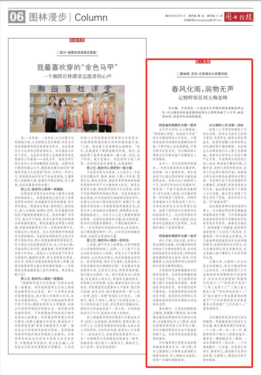 喜欢看书已退休的80高龄王教授,因腿脚不便来馆,每次都通过微信把要借的书名发给刘老师,为他提供送书上门服务。虽然这些都是图书馆工作中的小事,但刘玉梅老师依旧乐此不疲地坚持做下去,为更多的读者提供满意的服务。