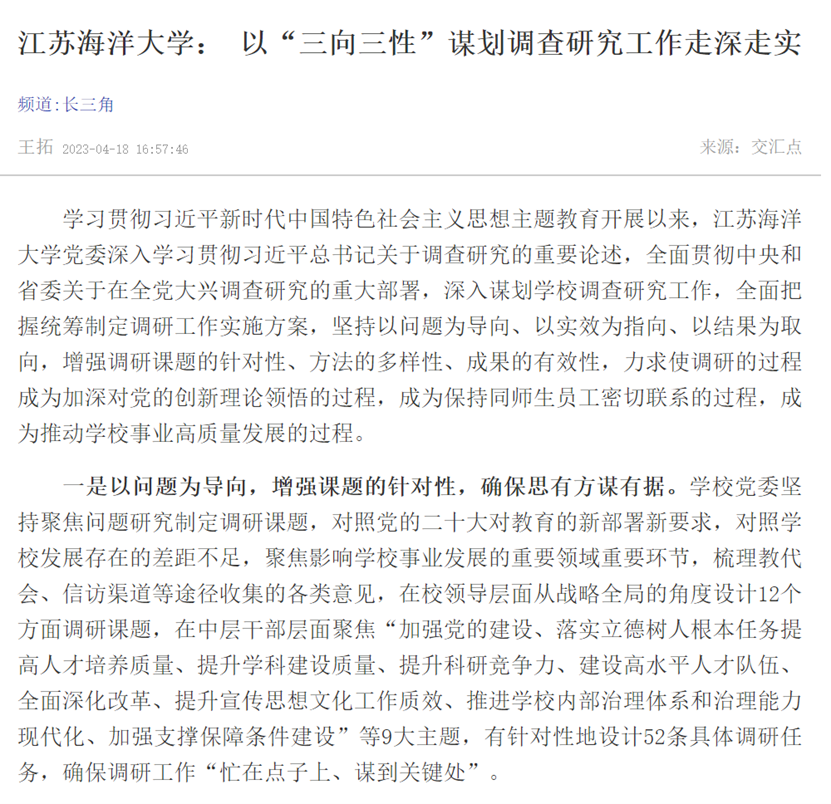学习贯彻习近平新时代中国特色社会主义思想主题教育开展以来,9999js金沙老品牌党委深入学习贯彻习近平总书记关于调查研究的重要论述,全面贯彻中央和省委关于在全党大兴调查研究的重大部署,深入谋划学校调查研究工作,全面把握统筹制定调研工作实施方案,坚持以问题为导向、以实效为指向、以结果为取向,增强调研课题的针对性、方法的多样性、成果的有效性,力求使调研的过程成为加深对党的创新理论领悟的过程,成为保持同师生员工密切联系的过程,成为推动学校事业高质量发展的过程。