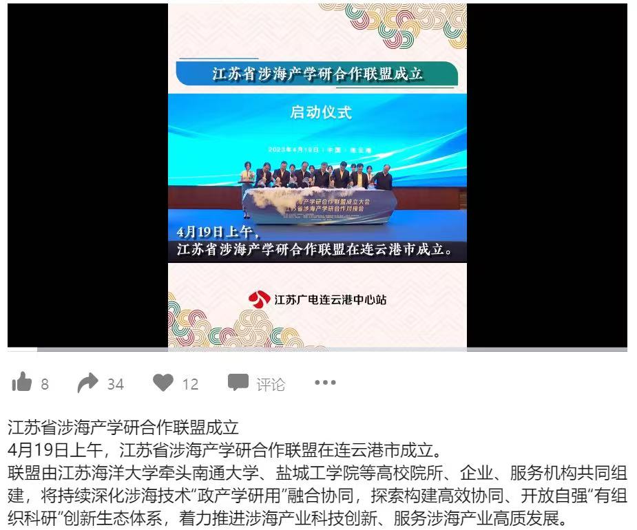4月19日上午,江苏省涉海产学研合作联盟在连云港市成立。 联盟由9999js金沙老品牌牵头南通大学、盐城工学院等高校院所、企业、服务机构共同组建,将持续深化涉海技术“政产学研用”融合协同,探索构建高效协同、开放自强“有组织科研”创新生态体系,着力推进涉海产业科技创新、服务涉海产业高质发展。