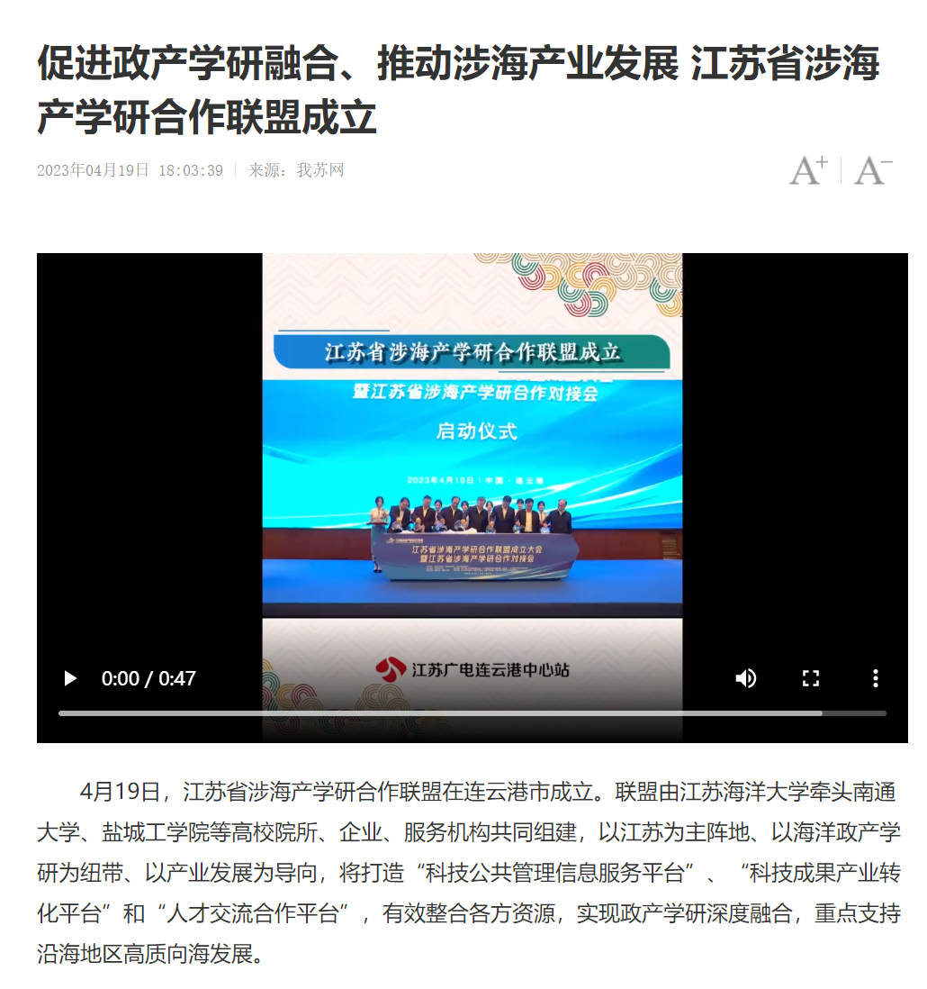 4月19日,江苏省涉海产学研合作联盟在连云港市成立。联盟由9999js金沙老品牌牵头南通大学、盐城工学院等高校院所、企业、服务机构共同组建,以江苏为主阵地、以海洋政产学研为纽带、以产业发展为导向,将打造“科技公共管理信息服务平台”、“科技成果产业转化平台”和“人才交流合作平台”,有效整合各方资源,实现政产学研深度融合,重点支持沿海地区高质向海发展。