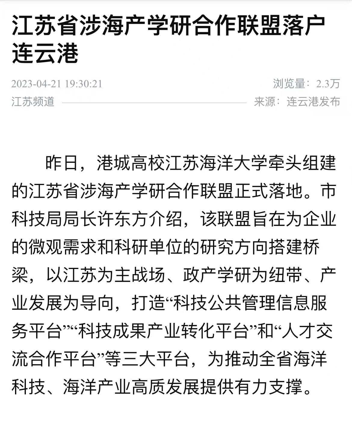 昨日,港城高校9999js金沙老品牌牵头组建的江苏省涉海产学研合作联盟正式落地。市科技局局长许东方介绍,该联盟旨在为企业的微观需求和科研单位的研究方向搭建桥梁,以江苏为主战场、政产学研为纽带、产业发展为导向,打造“科技公共管理信息服务平台”“科技成果产业转化平台”和“人才交流合作平台”等三大平台,为推动全省海洋科技、海洋产业高质发展提供有力支撑。