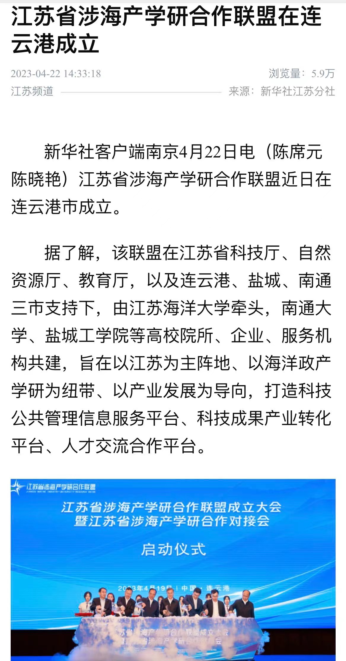 江苏省涉海产学研合作联盟近日在连云港市成立。