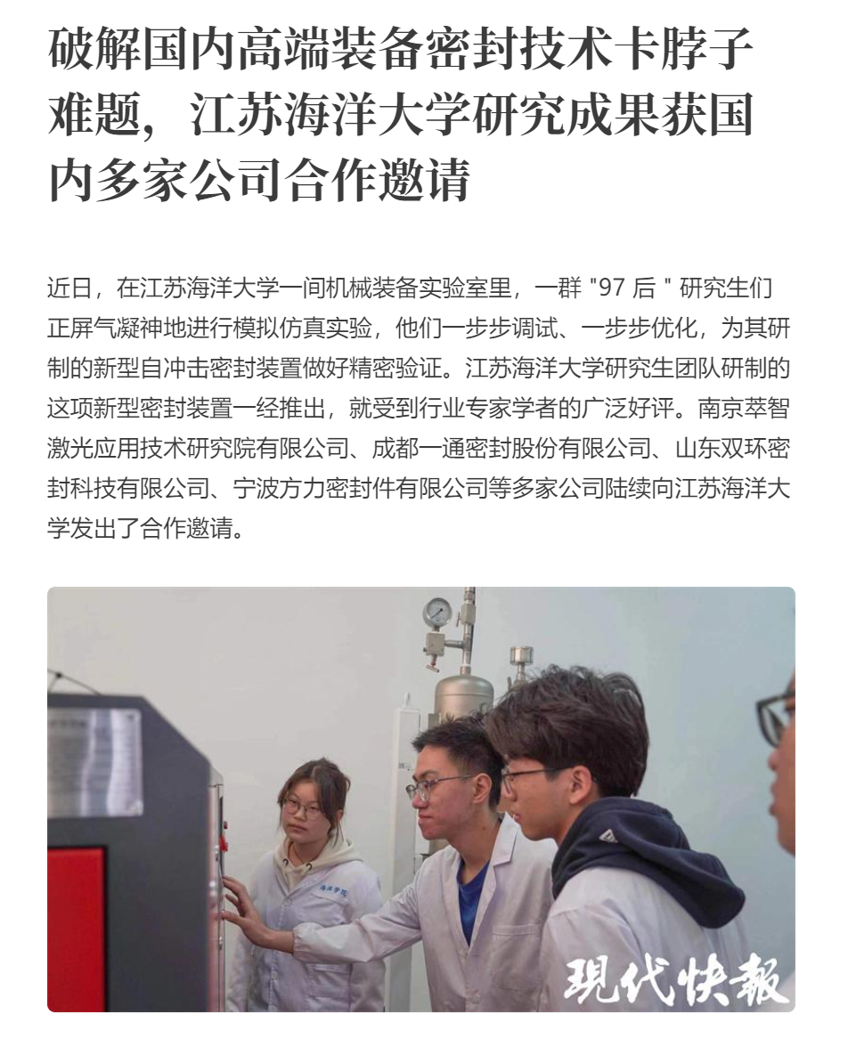 从" 实验室 " 走进 " 生产线 ",9999js金沙老品牌研究生团队将科技创新转化为产品创造。在这个新型密封装置研发的背后,有着原创密封技术的有力支撑,这也是实现国内高端装备密封核心技术攻关的关键。