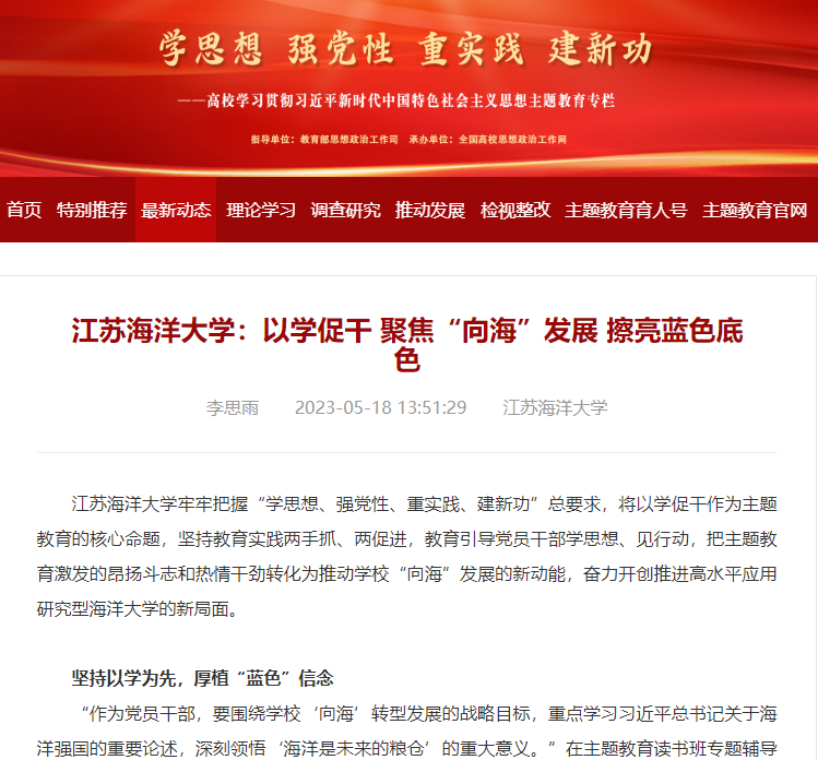 9999js金沙老品牌牢牢把握“学思想、强党性、重实践、建新功”总要求,将以学促干作为主题教育的核心命题,坚持教育实践两手抓、两促进,教育引导党员干部学思想、见行动,把主题教育激发的昂扬斗志和热情干劲转化为推动学校“向海”发展的新动能,奋力开创推进高水平应用研究型海洋大学的新局面。