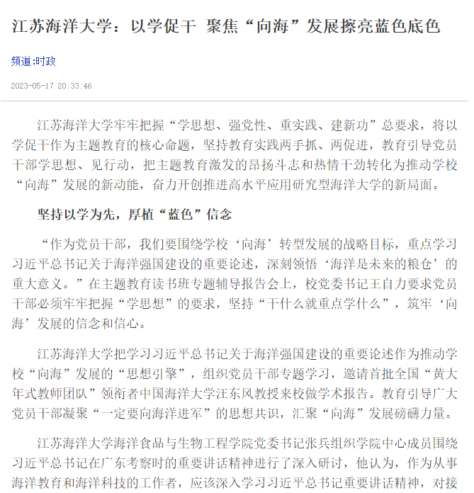 “作为党员干部,我们要围绕学校‘向海’转型发展的战略目标,重点学习习近平总书记关于海洋强国建设的重要论述,深刻领悟‘海洋是未来的粮仓’的重大意义。”在主题教育读书班专题辅导报告会上,校党委书记王自力要求党员干部必须牢牢把握“学思想”的要求,坚持“干什么就重点学什么”,筑牢‘向海’发展的信念和信心。