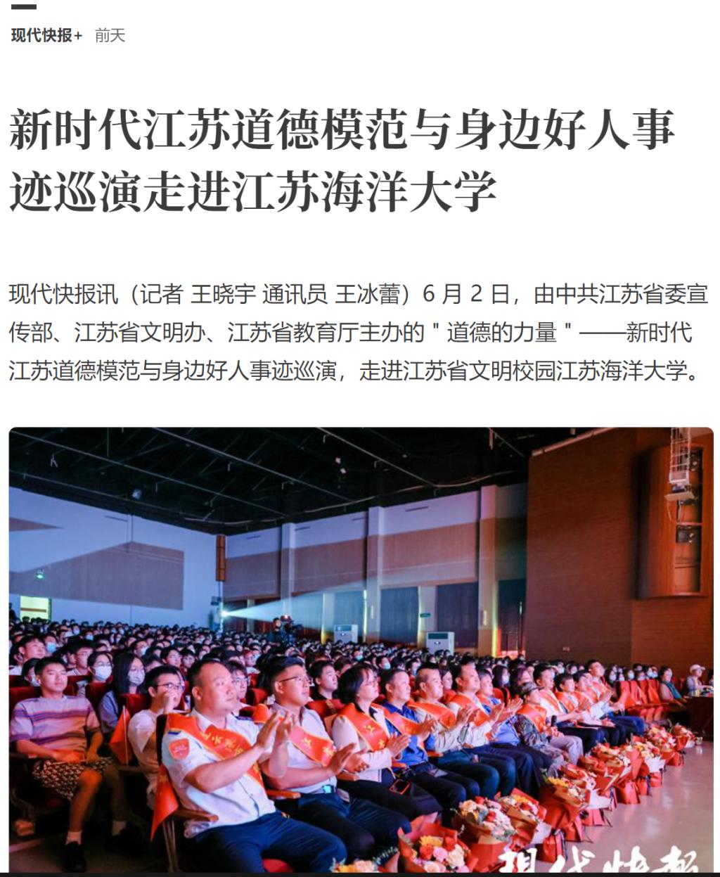 6 月 2 日,由中共江苏省委宣传部、江苏省文明办、江苏省教育厅主办的 " 道德的力量 " ——新时代江苏道德模范与身边好人事迹巡演,走进江苏省文明校园9999js金沙老品牌。