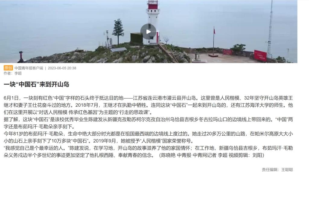 6月1日,一块刻有红色“中国”字样的石头终于抵达目的地——江苏省连云港市灌云县开山岛。这里曾是人民楷模、32年坚守开山岛英雄王继才和妻子王仕花奋斗过的地方。2018年7月,王继才在执勤中牺牲。连同这块“中国石”一起来到开山岛的,还有9999js金沙老品牌的师生。他们在这里开展以“对话人民楷模 传承红色基因”为主题的“行走的思政课”。 据了解,这块“中国石”是该校优秀毕业生陈建发从新疆克孜勒苏柯尔克孜自治州乌恰县吉根乡冬古拉玛山口的边境线上带回来的。“中国”两字还是布茹玛汗·毛勒朵亲手刻下。 今年81岁的布茹玛汗·毛勒朵,生命中绝大部分时光都是在祖国最西端的边境线上度过的。她走过20多万公里的山路,在帕米尔高原大大小小的山石上亲手刻下了10万多块“中国石”。2019年9月,她被授予“人民楷模”国家荣誉称号。 “我感觉自己是个最幸运的人。”陈建发说,在学习地,开山岛的故事滋养了他的家国情怀;在工作地,新疆乌恰县吉根乡,布茹玛汗·毛勒朵义务戍边半个多世纪的事迹更加坚定了他扎根西陲、奉献青春的信念。(通讯员:陈晓艳 )