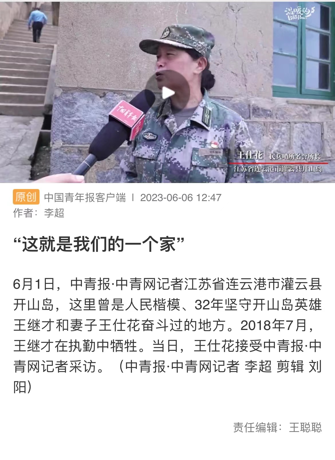 6月1日,中青报·中青网记者江苏省连云港市灌云县开山岛,这里曾是人民楷模、32年坚守开山岛英雄王继才和妻子王仕花奋斗过的地方。2018年7月,王继才在执勤中牺牲。当日,王仕花接受中青报·中青网记者采访。