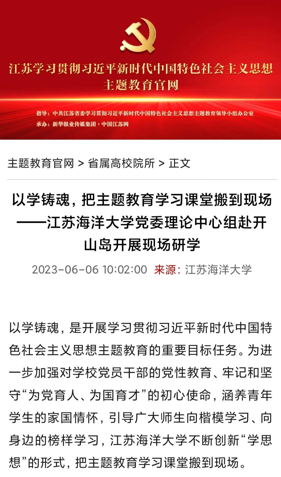 6月1日上午,校党委理论中心组成员和部分师生代表80余人乘坐“学习强国”号客轮,从码头至全国爱国主义教育基地、党性教育基地——开山岛。全省第一批学习贯彻习近平新时代中国特色社会主义思想主题教育第二十五巡回指导组成员凌昌满和刘牧同志一同参加研学。
