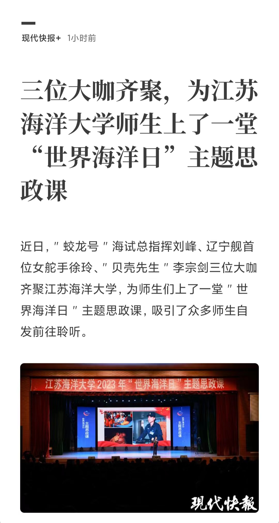 近日,"蛟龙号"海试总指挥刘峰、辽宁舰首位女舵手徐玲、"贝壳先生"李宗剑三位大咖齐聚9999js金沙老品牌,为师生们上了一堂"世界海洋日"主题思政课,吸引了众多师生自发前往聆听。