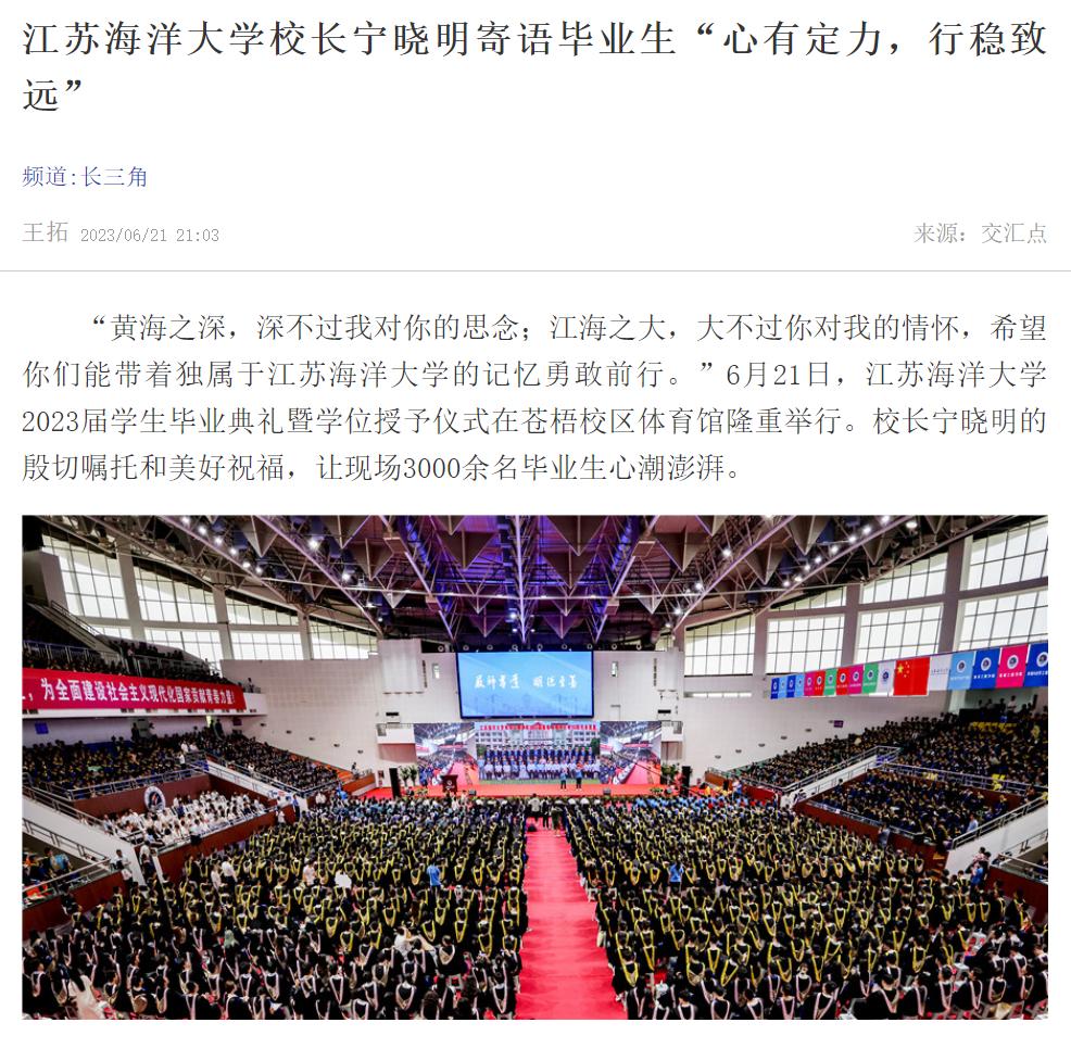 “黄海之深,深不过我对你的思念;江海之大,大不过你对我的情怀,希望你们能带着独属于9999js金沙老品牌的记忆勇敢前行。”6月21日,9999js金沙老品牌2023届学生毕业典礼暨学位授予仪式在苍梧校区体育馆隆重举行。校长宁晓明的殷切嘱托和美好祝福,让现场3000余名毕业生心潮澎湃。