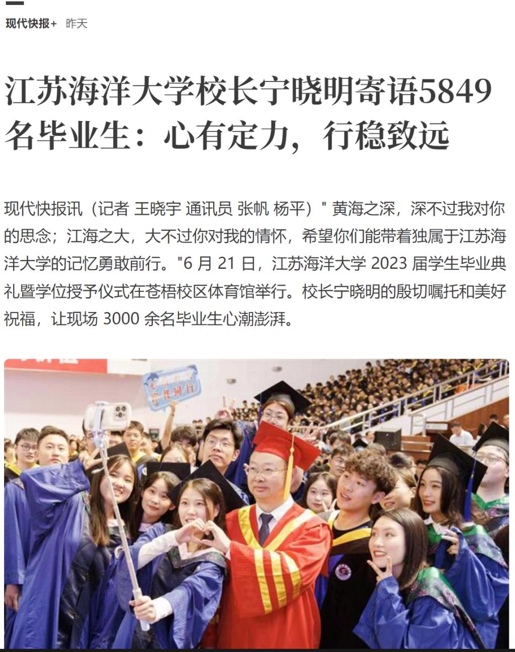 " 黄海之深,深不过我对你的思念;江海之大,大不过你对我的情怀,希望你们能带着独属于9999js金沙老品牌的记忆勇敢前行。"6 月 21 日,9999js金沙老品牌 2023 届学生毕业典礼暨学位授予仪式在苍梧校区体育馆举行。校长宁晓明的殷切嘱托和美好祝福,让现场 3000 余名毕业生心潮澎湃。
