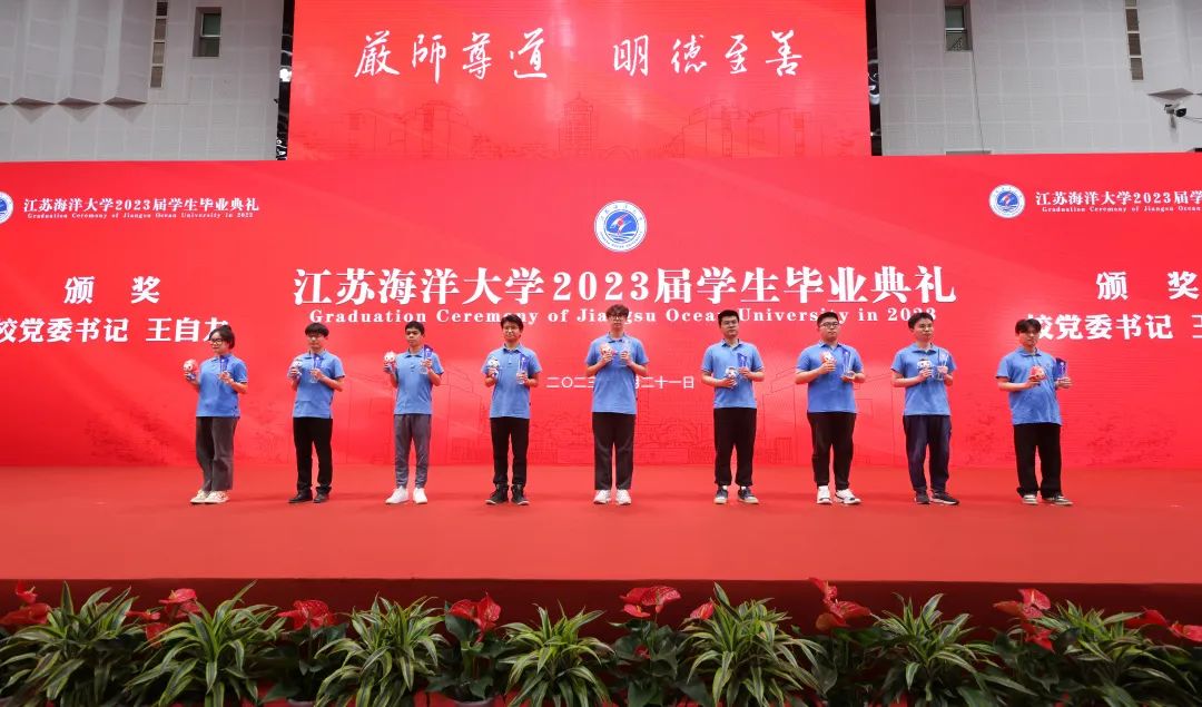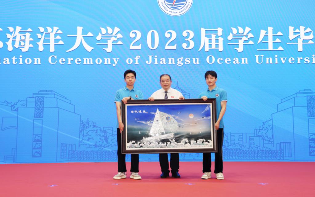 海洋科学与水产学院2023届毕业生代表全校毕业生精心设计制作了一幅贝雕作品《扬帆远航》,祝愿学校事业发展乘风破浪、勇毅前行、蒸蒸日上、再创辉煌。毕业生代表还向教职员工献花表达感恩之情。