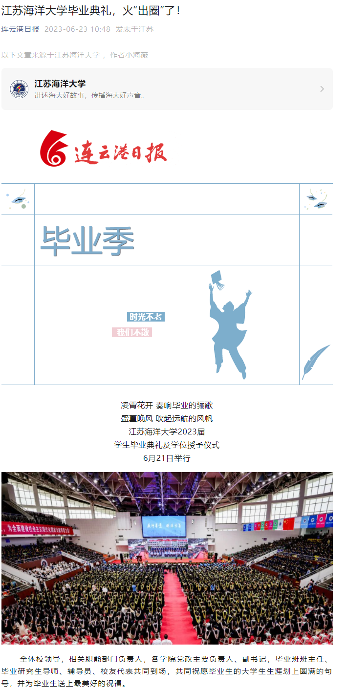 即将离开校园踏入社会,既有对过往的不舍,也有对学校的祝福、对未来的憧憬。本科生代表、环境与化学工程学院的李晴,研究生代表、海洋科学与水产学院的宋可心发言,依次分享自己的感受。他们用最质朴的语言、最真挚的情感表达了所有江海大毕业生的心声。