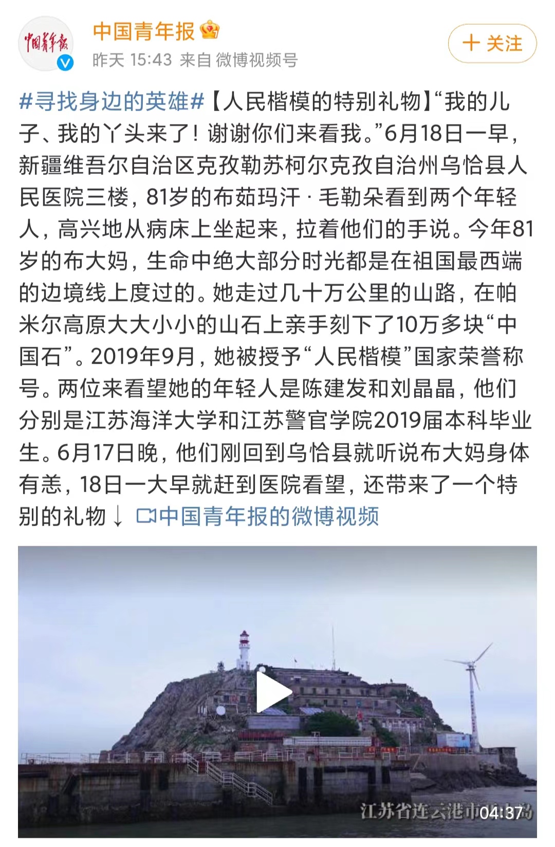 “我的儿子、我的丫头来了!谢谢你们来看我。”6月18日一早,新疆维吾尔自治区克孜勒苏柯尔克孜自治州乌恰县人民医院三楼,81岁的布茹玛汗·毛勒朵看到两个年轻人,高兴地从病床上坐起来,拉着他们的手说。今年81岁的布大妈,生命中绝大部分时光都是在祖国最西端的边境线上度过的。她走过几十万公里的山路,在帕米尔高原大大小小的山石上亲手刻下了10万多块“中国石”。2019年9月,她被授予“人民楷模”国家荣誉称号。两位来看望她的年轻人是陈建发和刘晶晶,他们分别是9999js金沙老品牌和江苏警官学院2019届本科毕业生。6月17日晚,他们刚回到乌恰县就听说布大妈身体有恙,18日一大早就赶到医院看望,还带来了一个特别的礼物。