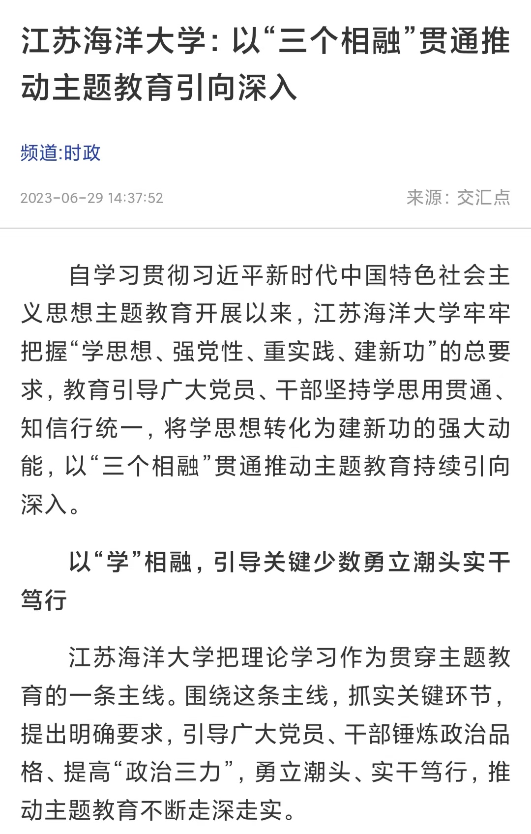 6月1日,校党委理论中心组成员和部分师生代表80余人乘坐“学习强国”号客轮,前往全国爱国主义教育基地、党性教育基地——开山岛,他们一路研学,将主题教育“行走的党课”搬到现场。创新主题教育学习形式,通过沉浸式学习和体验式互动,感悟楷模精神,涵养家国情怀,在以学铸魂中牢记“为党育人、为国育才”的初心使命。