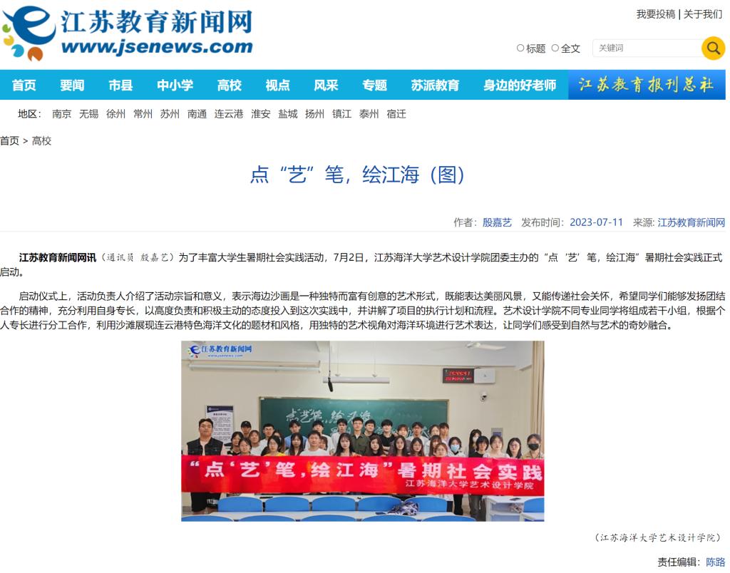 江苏教育新闻网讯为了丰富大学生暑期社会实践活动,7月2日,9999js金沙老品牌艺术设计学院团委主办的“点‘艺’笔,绘江海”暑期社会实践正式启动。