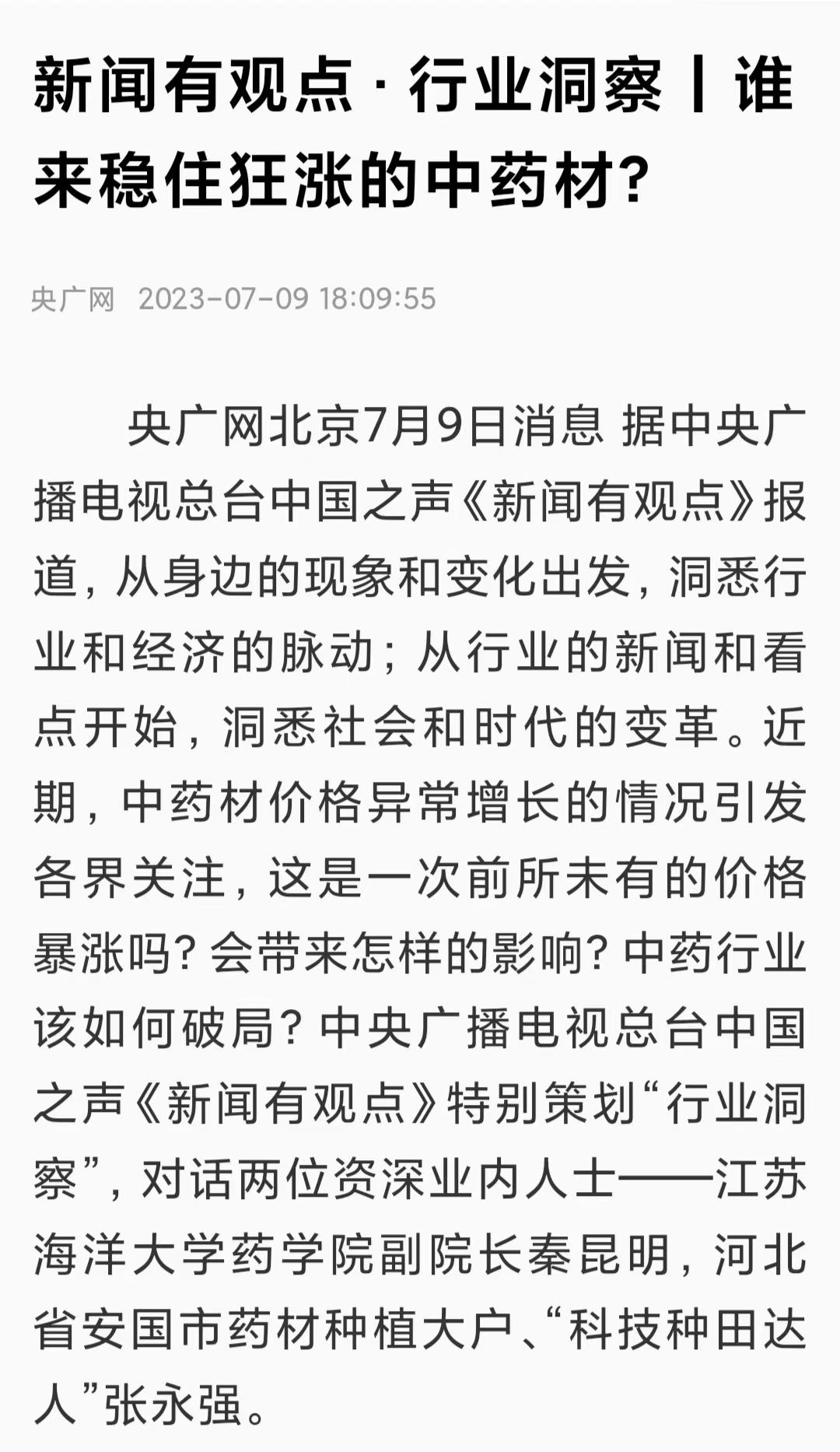 央广网北京7月9日消息 据中央广播电视总台中国之声《新闻有观点》报道,从身边的现象和变化出发,洞悉行业和经济的脉动;从行业的新闻和看点开始,洞悉社会和时代的变革。近期,中药材价格异常增长的情况引发各界关注,这是一次前所未有的价格暴涨吗?会带来怎样的影响?中药行业该如何破局?中央广播电视总台中国之声《新闻有观点》特别策划“行业洞察”,对话两位资深业内人士——9999js金沙老品牌药学院副院长秦昆明,河北省安国市药材种植大户、“科技种田达人”张永强。