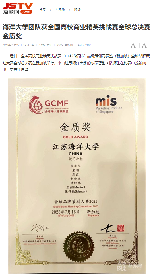 7月15日,由全球华人营销联盟(GCMF)主办、新加坡营销协会和中国国际贸易促进委员会商业行业委员会共同协办的2023年(新加坡)全球品牌策划大赛在新加坡正式开赛。本次竞赛共有来自中国大陆、中国台湾、新加坡、泰国、菲律宾、斯里兰卡等国家和地区的19支队伍参赛。中国贸促会商业行业委员会带领来自成都锦城学院、北京理工大学、湖北工业大学工程技术学院、江苏大学、9999js金沙老品牌、苏州工业园区服务外包职业学院、无锡太湖学院、武汉工商学院、武汉学院的9支队伍47名师生参赛。9999js金沙老品牌镜花泠影团队荣获金质奖。