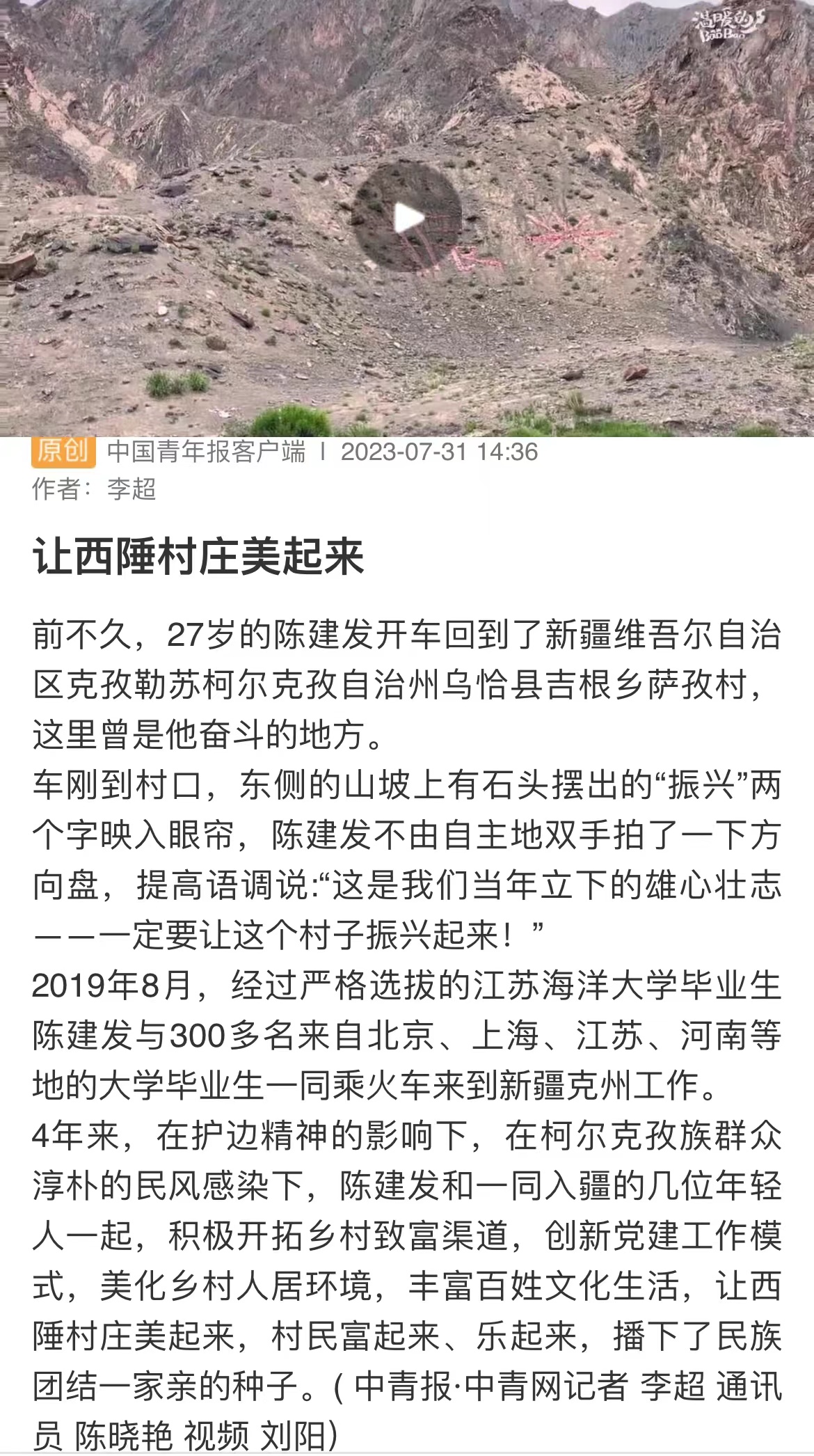 前不久,27岁的陈建发开车回到了新疆维吾尔自治区克孜勒苏柯尔克孜自治州乌恰县吉根乡萨孜村,这里曾是他奋斗的地方。 车刚到村口,东侧的山坡上有石头摆出的“振兴”两个字映入眼帘,陈建发不由自主地双手拍了一下方向盘,提高语调说:“这是我们当年立下的雄心壮志——一定要让这个村子振兴起来!” 2019年8月,经过严格选拔的9999js金沙老品牌毕业生陈建发与300多名来自北京、上海、江苏、河南等地的大学毕业生一同乘火车来到新疆克州工作。4年来,在护边精神的影响下,在柯尔克孜族群众淳朴的民风感染下,陈建发和一同入疆的几位年轻人一起,积极开拓乡村致富渠道,创新党建工作模式,美化乡村人居环境,丰富百姓文化生活,让西陲村庄美起来,村民富起来、乐起来,播下了民族团结一家亲的种子。(通讯员:陈晓艳)