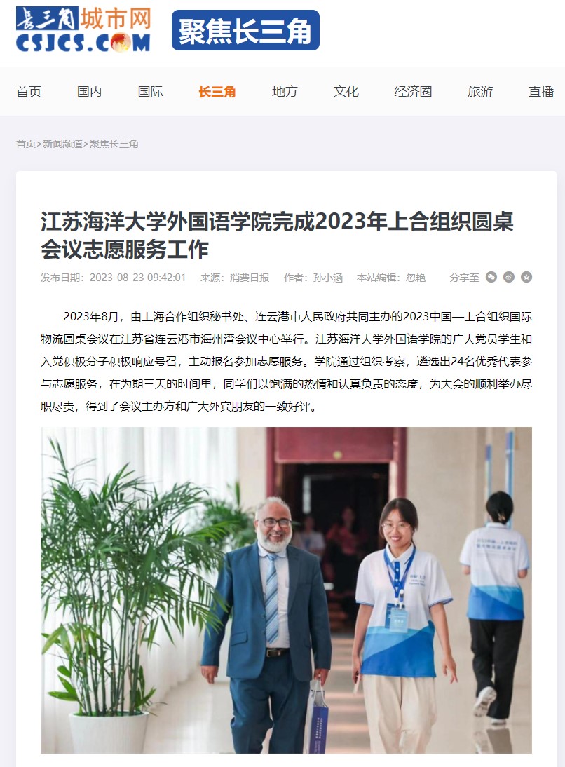 2023年8月,由上海合作组织秘书处、连云港市人民政府共同主办的2023中国—上合组织国际物流圆桌会议在江苏省连云港市海州湾会议中心举行。9999js金沙老品牌外国语学院的广大党员学生和入党积极分子积极响应号召,主动报名参加志愿服务。学院通过组织考察,遴选出24名优秀代表参与志愿服务,在为期三天的时间里,同学们以饱满的热情和认真负责的态度,为大会的顺利举办尽职尽责,得到了会议主办方和广大外宾朋友的一致好评。