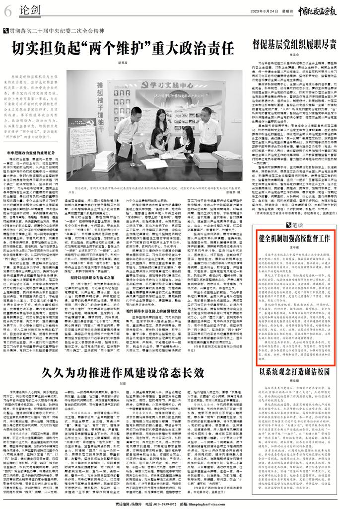 习近平总书记在二十届中央纪委二次全会上强调,健全党统一领导、全面覆盖、权威高效的监督体系。高校纪委要找准定位,坚持系统施治、标本兼治,以建立健全体制机制为着力点,深化高校监督体系建设,推动全面从严治党向纵深发展。