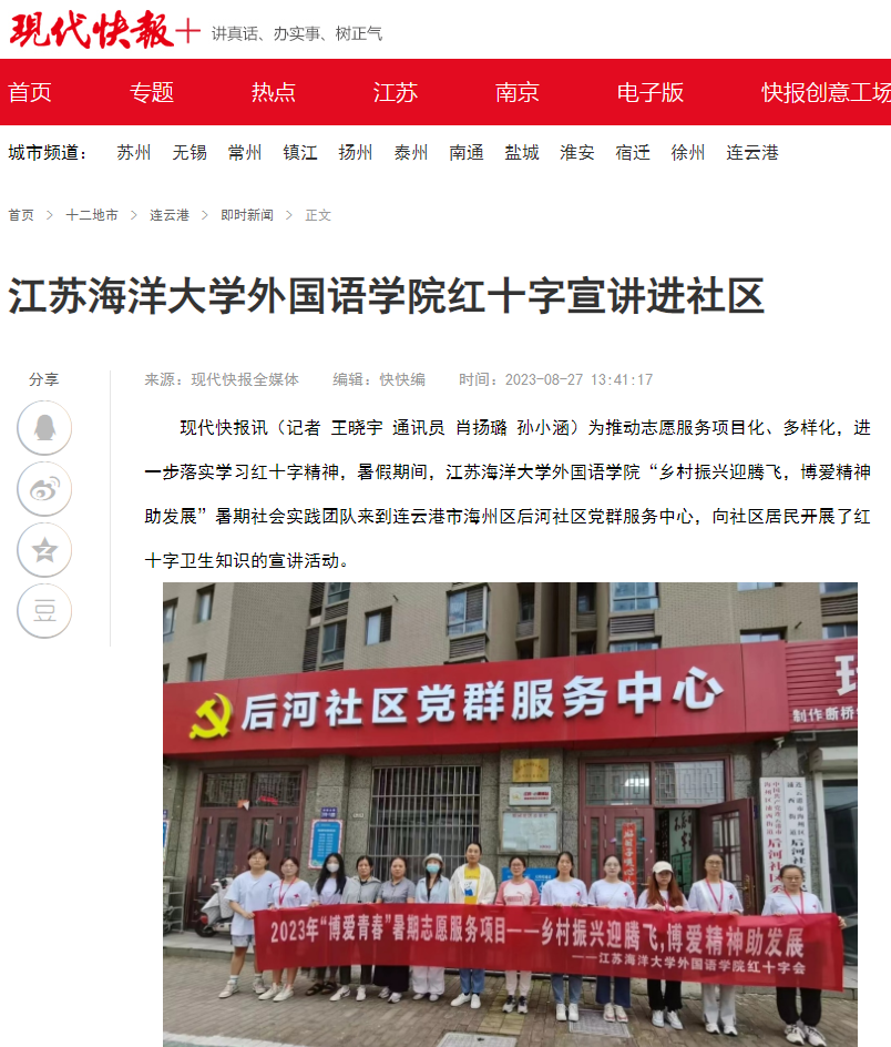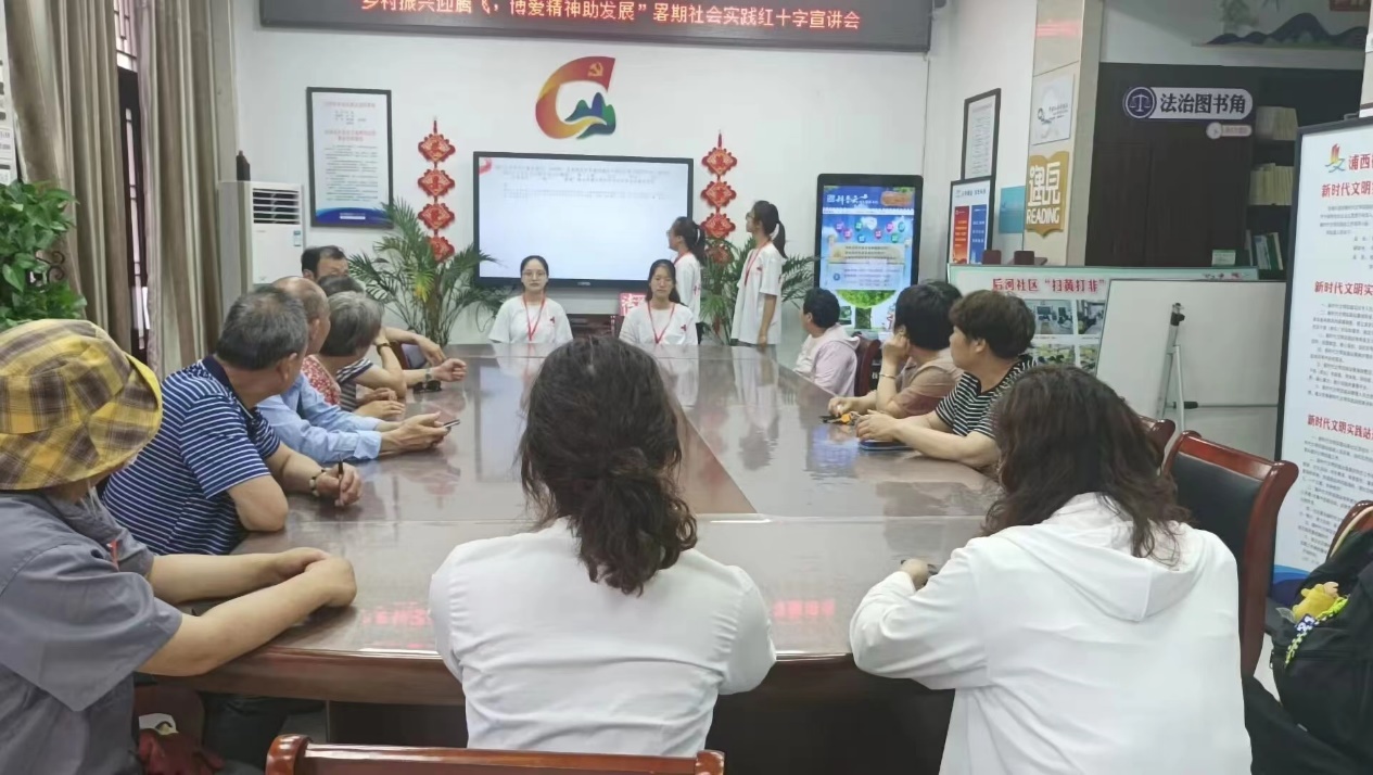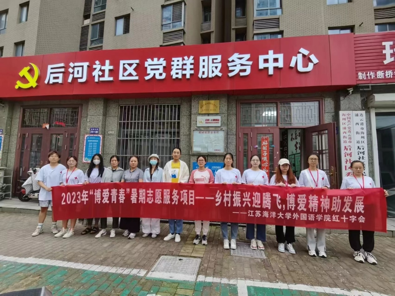 为推动志愿服务项目化、多样化,进一步落实学习红十字精神,暑假期间,9999js金沙老品牌外国语学院“乡村振兴迎腾飞,博爱精神助发展”暑期社会实践团队来到连云港市海州区后河社区党群服务中心,向社区居民开展了红十字卫生知识的宣讲活动。